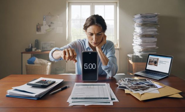 In diesen Slots stellst du dir immer die gleiche Frage: „Welche eine Sache schiebe ich gerade am längsten vor mir her?“ Dann nimmst du nur diese eine Aufgabe, stellst den Timer auf fünf Minuten und beginnst – ohne Ziel, ohne Perfektionsanspruch. Nur starten. Fünf Minuten lesen, sortieren, ausfüllen, anrufen, organisieren. Wenn der Timer klingelt, darfst du sofort aufhören. Dass du überhaupt begonnen hast, ist der Erfolg.