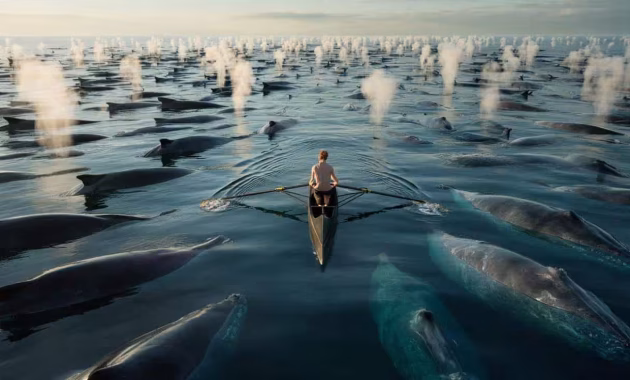 The rower held his breath, transfixed by the sight of these majestic giants surrounding him, their massive bodies gliding effortlessly through the water. He had heard tales of such encounters, but nothing could have prepared him for the overwhelming sense of wonder and vulnerability he now felt, a lone human amidst a thousand oceanic titans.