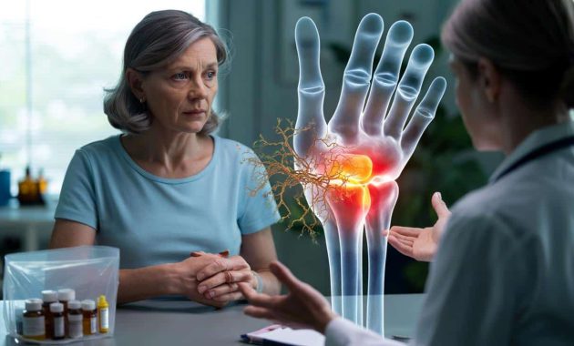 The woman in front of the rheumatologist’s desk is in her early 40s and already exhausted. Her hands are swollen from arthritis, her eyes sting from yet another bad night, and she’s clutching a plastic bag full of pill bottles that rattle when she shifts in her chair. On the wall behind the doctor, a poster shows bright red joints on a grey skeleton, like tiny fires burning in the body.