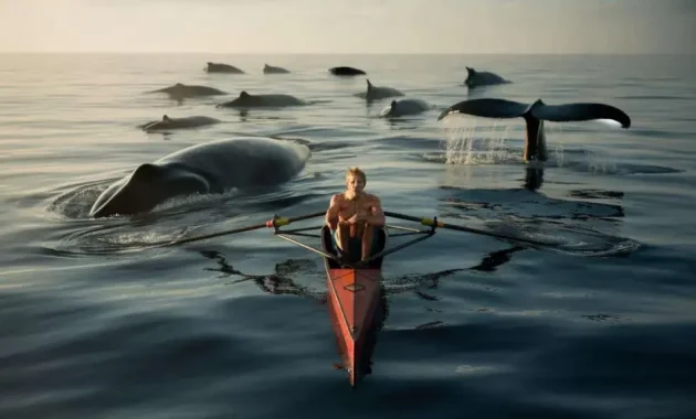 As the rower’s oar slices through the water, the world around them fades, replaced by a hypnotic dance between the individual and the elements. But this solitary odyssey is not without its unexpected encounters, for as the rower navigates the vast, seemingly endless blue, they are met with a sight that will forever change their perspective – the majestic presence of whales, surfacing from the depths like ancient guardians of the sea.