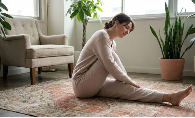 This final group of stretches may bring back memories of physical education classes. Opening your legs wider adjusts the hip angle and creates additional room in your lower back and inner thigh area. Sit down on the floor and spread your legs into a relaxed V position without forcing them too far apart. Start by leaning gently toward the middle while extending your hands forward and hold this position briefly. Return to sitting upright and then lean toward your right leg while allowing your hands to settle naturally. Sit up straight once more and do the same movement toward your left leg. Take your time with each position & breathe steadily while you repeat the sequence of center to right to left several times. These wide-leg stretches offer a quiet satisfaction that feels somewhat familiar. They give us a chance to approach an old activity with more calmness and patience than we typically had during childhood.
